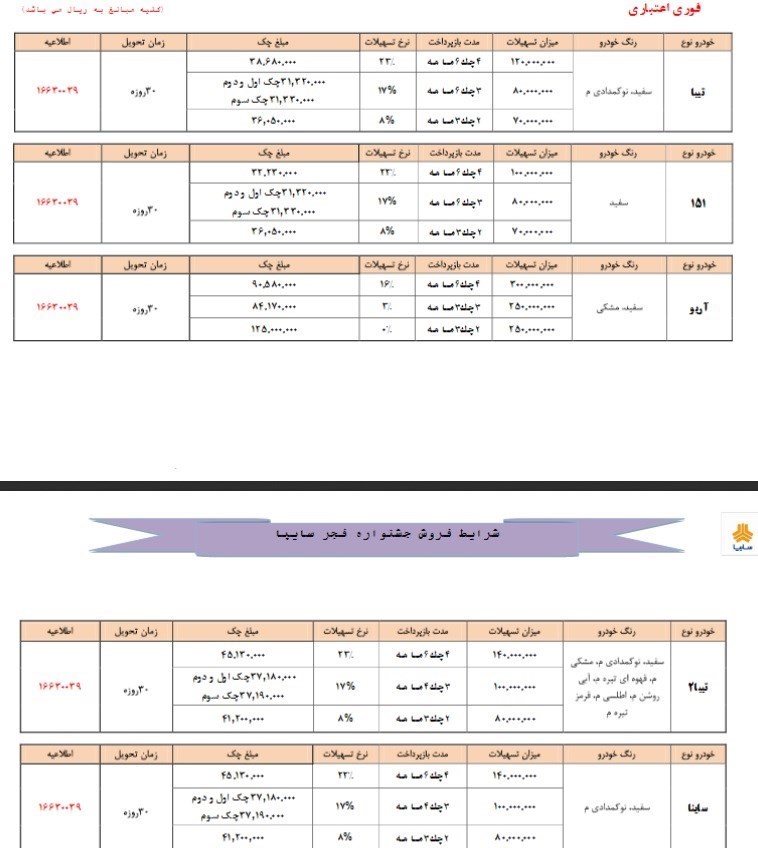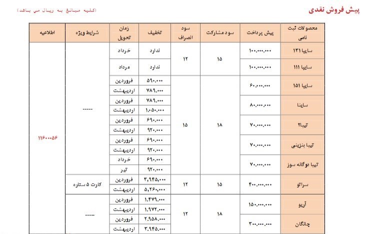 جزئیات فروش ویژه بهمن ماه شرکت سایپا به شرح زیر است: