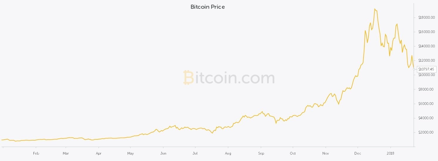 یکماهه اواسط نوامبر تا اواسط دسامبر 2017 اوج تشدید نوسانات این ارز است، بهگونهای که از 6000 در اواسط نوامبر به 19186 دلار در یک ماه بعد از آن میرسد و رکورد میزند. پس از آن تا انتهای سال نیز با نوساناتی روند کاهشی بهخود میگیرد و اواخر دسامبر به 12600 میرسد؛ هماکنون باز هم نرخ برابری این ارز دیجیتالی کاهش یافته و به 10797.45 رسیده است.
