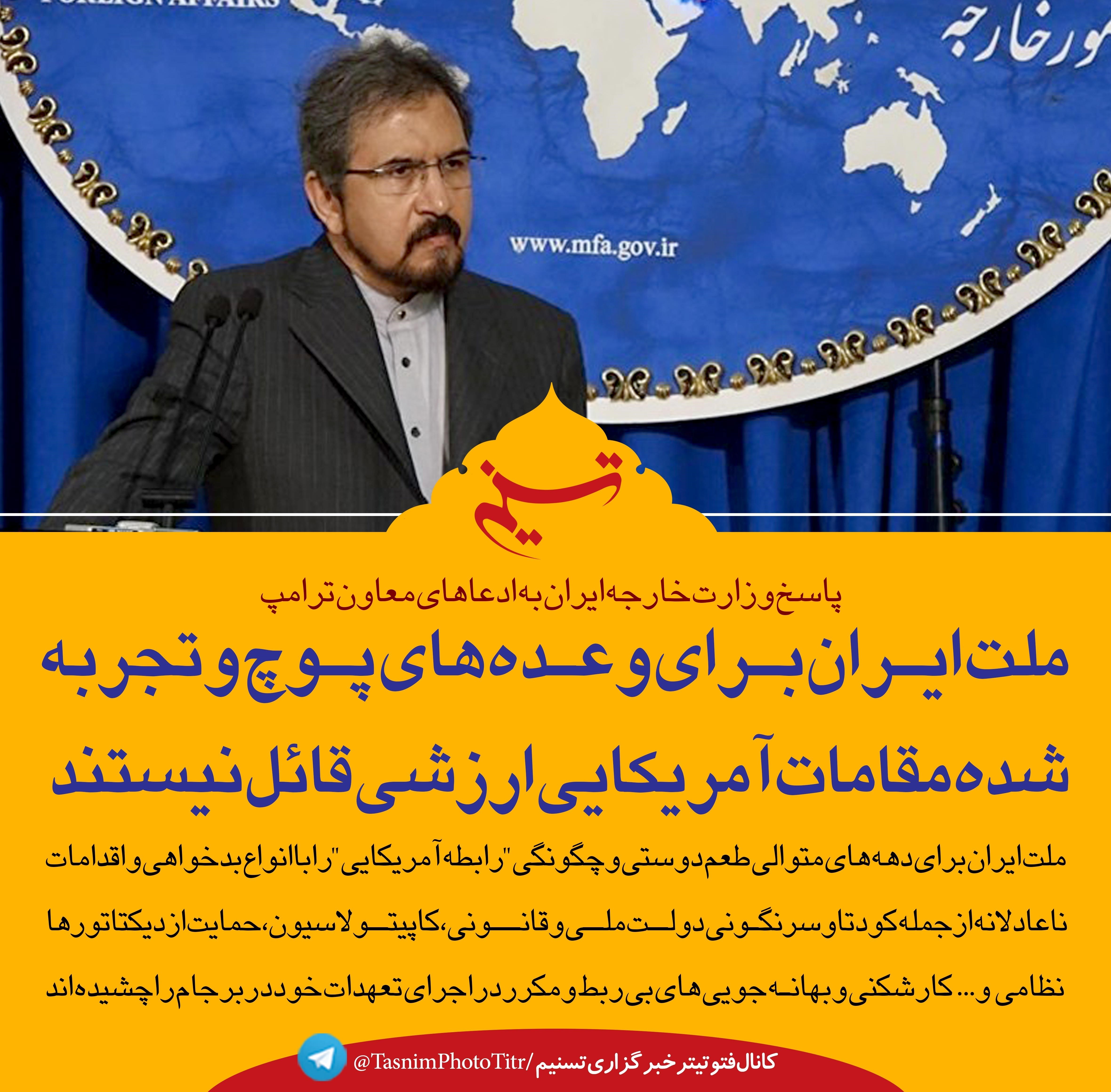 سخنگوی وزارت امور خارجه در واکنش به گفتار و اتهامات نادرست و از سر خصومت معاون رئیس‌جمهور آمریکا گفت: ملت ایران برای دهه‌های متوالی طعم دوستی و چگونگی "رابطه آمریکایی" را چشیده‌اند و برای وعده‌های پوچ و تجربه‌شده مقامات آمریکایی ارزشی قائل نیستند.