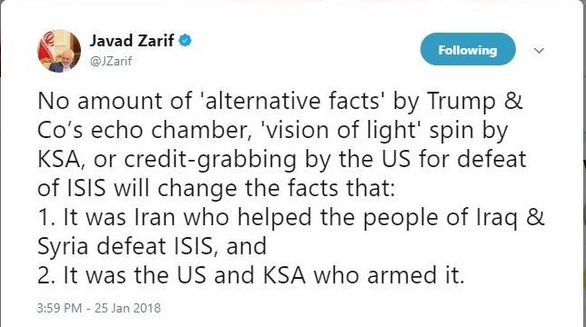 ظریف در واکنش نوشت: «هر قدر بوقهای تبلیغاتی ترامپ و همدستانشان "حقایق جایگزین (تقلبی)" تولید کنند، هر میزان که عربستان سعودی بازی تبلیغاتی "چشم انداز نورانی" (اشاره به ادعای وزیر خارجه سعودی در داووس) راه بیندازد و هر قدر آمریکا تلاش کند شکست داعش را به نام خود ثبت نماید، نمی توانند واقعیت‌های زیر را تغییر دهند: 1-  این ایران بود که برای شکست دادن داعش به کمک مردم عراق و سوریه شتافت؛ و 2- این آمریکا و عربستان سعودی بودند که به داعش سلاح دادند.»