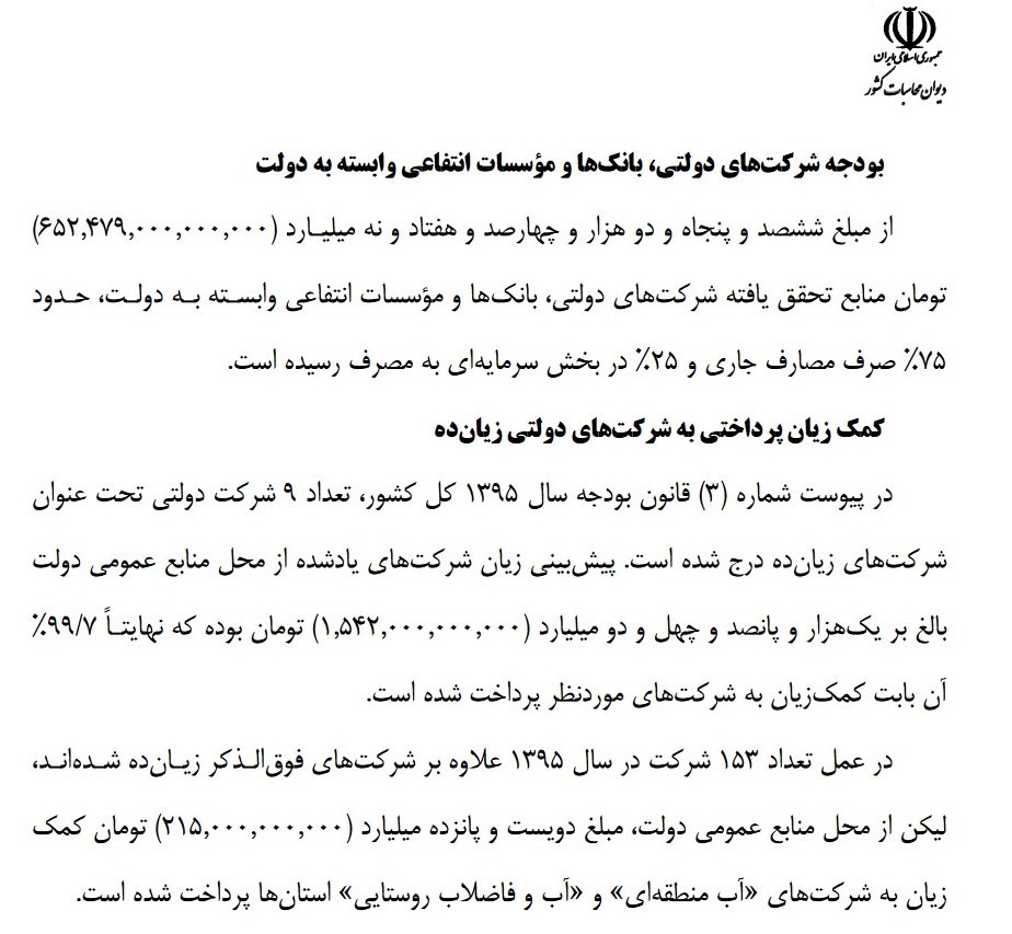 در قانون بودجه 95 تعداد 9 شرکت دولتی تحت عنوان شرکت زیان ده درج شده بود و برای جبران زیان این 9 شرکت 1500 میلیارد تومان پرداخت شده است. این در حالی است که در پایان سال گذشته 153 شرکت علاوه بر 9 شرکت مذکور زیان ده شدهاند. بر این مبنا 215 میلیارد تومان از بودجه عمومی برای جبران زیان آنها لحاظ شده است.
