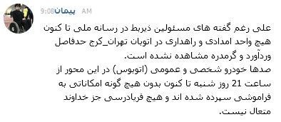 این در حالی بود که مسئولان پلیس، راهداری و هلال احمر همگی از آمادگی کامل در طول شب گذشته خبر میدادند غافل از آنکه آنچه از فیلمها و تصاویر و نوشتههای مردم در شبکههای اجتماعی منتشر میشد چیزی مغایر با گفتههای آنها بود و مردم در شرایطی در محورهای مواصلاتی منتهی به تهران گرفتار شده بودند که نه آذوقهای در اختیار آنها قرار گرفت و نه وسائل گرم کننده و سوخت.