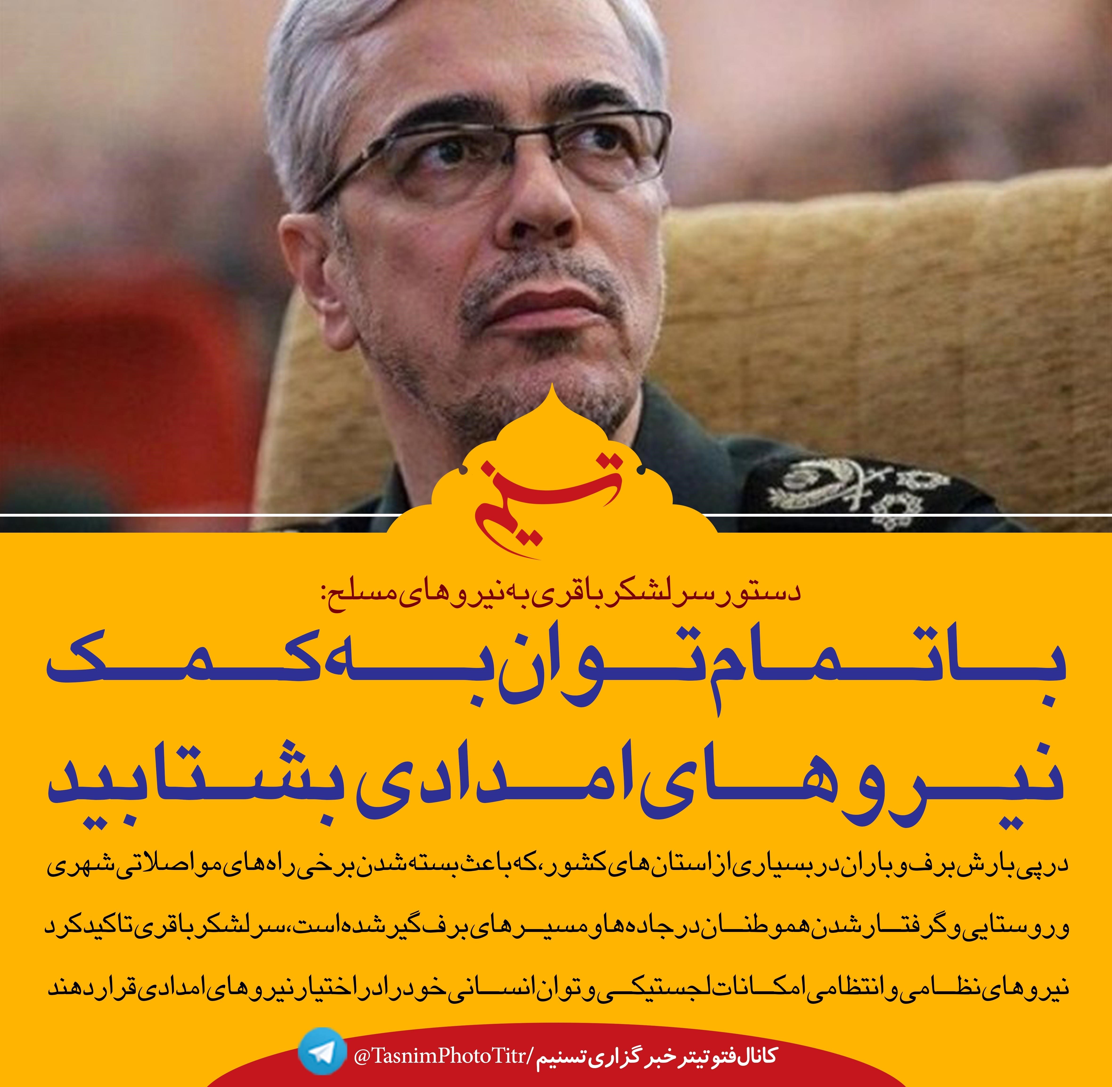 رئیس ستاد کل نیروهای مسلح دستور داد تا نیروهای مسلح برای کمک به روند امدادرسانی در مناطق برف‌گیر، با تمام توان وارد میدان شوند.