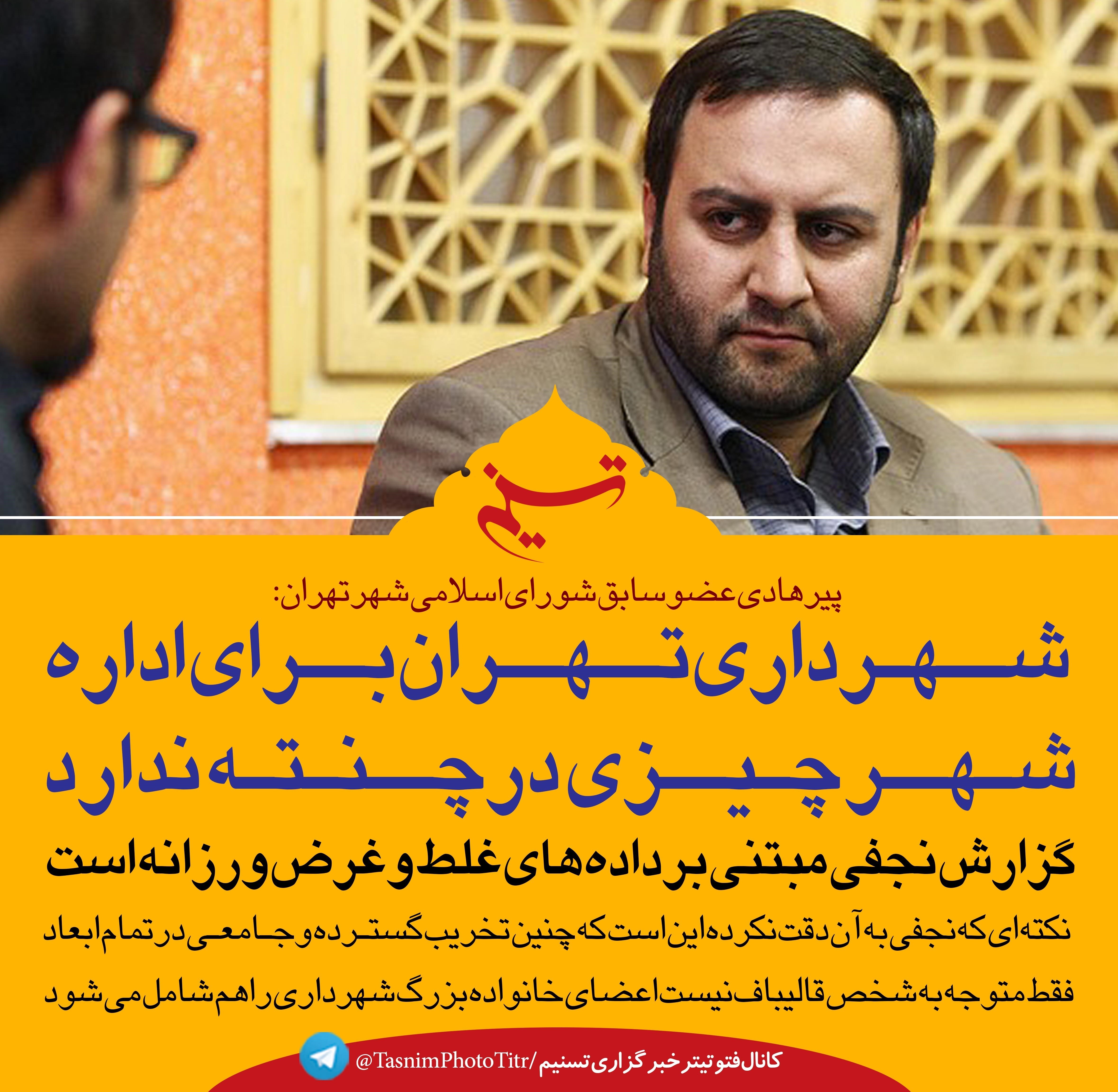 عضو سابق شورای شهر تهران با بیان که شهرداری تهران در این دوره برای اداره شهر چیزی در چنته ندارد،گفت: آنچه ماجرای گزارش نجفی را مشکوک و خاص می‌کند، دومسئله است اول آنکه او خود 7 سال عضو شورای شهر بوده و از موافقین شهردار قبل بوده و به او رای داده است