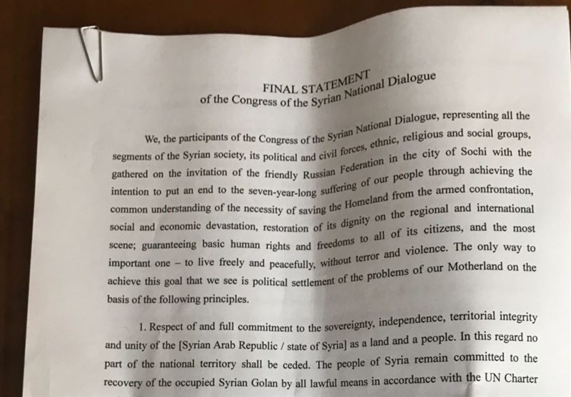 به گزارش گروه بینالملل خبرگزاری تسنیم، پیشنویس بیانیه پایانی کنفرانس سوچی، توسط پایگاه شبکه خبری المیادین منتشر شد.