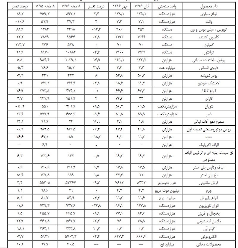 مطابق این گزارش تولید وانت منفی 10.6 درصد، نئوپان منفی 16.2 درصد، تلویزیون منفی 1.6 درصد اعلام شده است. در بخش تولید کالاهای منتخب معدنی وصنایع معدنی هم کاتد مس 29.4 درصد، ظروف شیشه ای 13.6 درصد کاهش داشته است. بیشترین حجم تولید در این بخش به شیشه جام با رشد 26.3 درصدی اختصاص دارد.