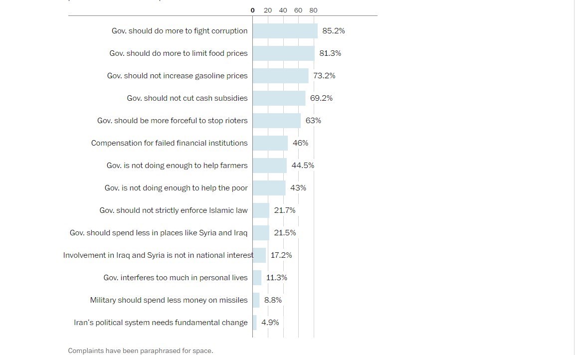 این نظرسنجی، البته نشان میدهد عموم مردم ایران خواستار مقابله با فساد و بهبود وضع معیشتی هستند. 85.2 درصد گفتهاند دولت بایستی اقدامات بیشتری برای مقابله با فساد انجام دهد. 81.3 درصد هم خواستار انجام اقدامات بیشتر برای کاهش هزینههای مواد غذایی شدهاند. 73.2 درصد میگویند دولت نباید قیمت سوخت را افزایش دهد. 69.2 درصد خواستار عدم قطع یارانه هستند.