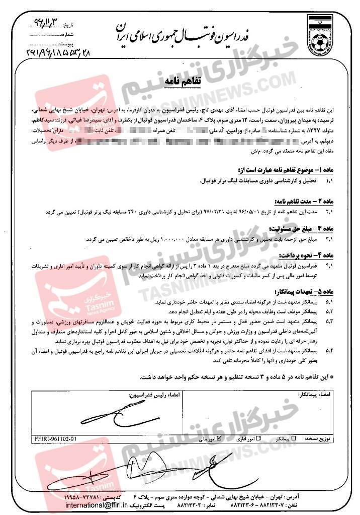 پیگیریهای خبرنگار تسنیم نشان میدهد یکی از مواردی که باعث گلایه و اعتراض برخی داوران شده، میزان دستمزدی است که فدراسیون فوتبال برای رضا غیاثی سخنگوی کمیته داوران در نظر گرفته است. در قراردادی که غیاثی با فدراسیون فوتبال تحت عنوان «تحلیل و کارشناسی داوری 240 مسابقه لیگ برتر فوتبال» از تاریخ اول مرداد 96 تا 31 اردیبهشت 97 منعقد کرده، آمده که «مبلغ حقالزحمه بابت تحلیل و کارشناسی هر مسابقه معادل 1000،0000 ریال است» و در ادامه آمده که این مبلغ «پس از کسر مالیات و کسورات قانونی و اخذ گواهی انجام کار پرداخت خواهد شد». در واقع اگر در نظر بگیریم 10 درصد بابت مالیات کسر شود، غیاثی برای آنالیز هر بازی 90 هزار تومان دریافت میکند و این رقم برای 240 مسابقه؛ 21 میلیون و 600 هزار تومان میشود.