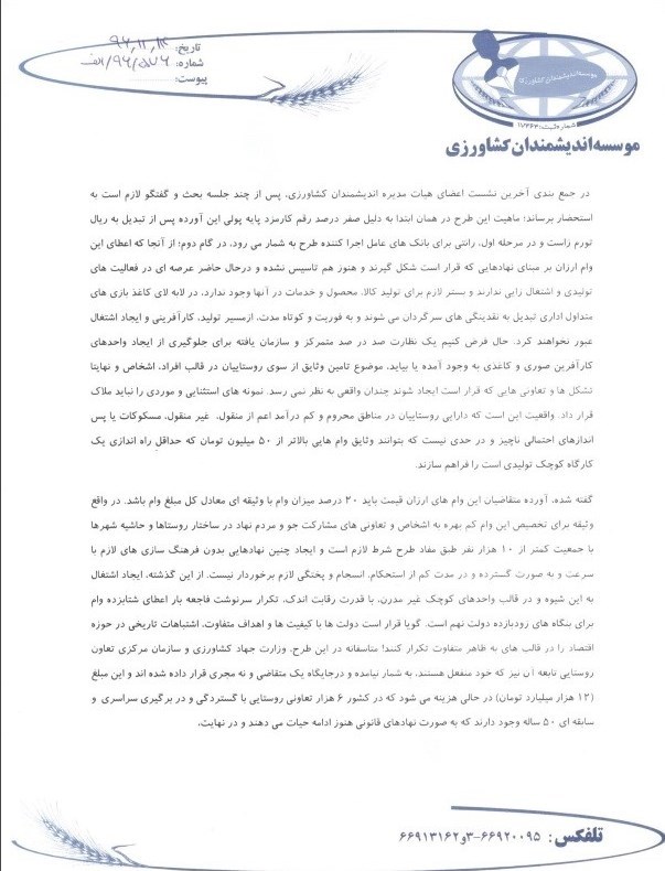 فراتر از آن، بخش عمده ای از این مبلغ، لامحاله به صورت نقدینگی و توسط سفته بازها، واسطه ها و دلالان حاضر و ناظر درچنین وام های ارزان قیمتی، وارد جامعه شهری خواهد شد که تورم آفرین است. نگارندگان این نامه سرگشاده، دولت را به تدبیر و تدَبُر در هزینه کرد این مبالغ هنگفت و با اتکا به تشکل های موجود در روستاها دعوت می کند و این بخشی نگری اقتصادی که آفت اقتصاد کلان است را مفید به حال منافع ملی نمی داند.