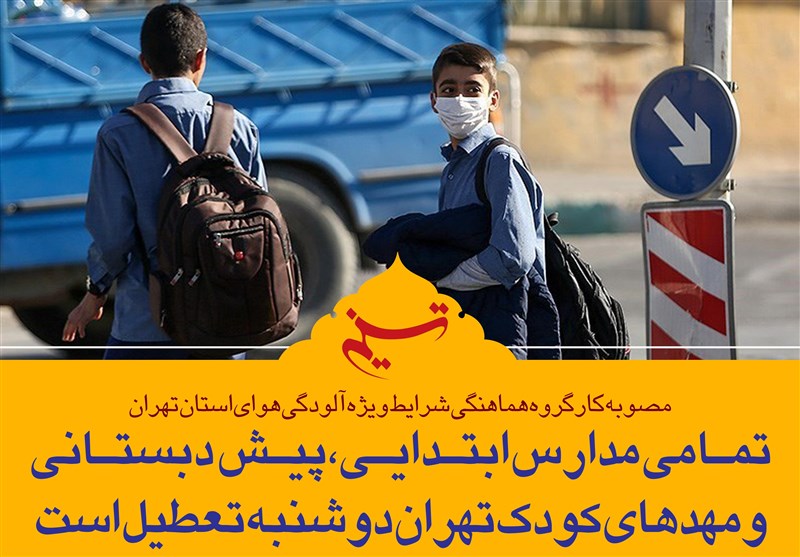 بنابر مصوبه کارگروه هماهنگی شرایط ویژه آلودگی هوای استان تهران تمامی مدارس پیش‌دبستانی، مهدهای کودک و مدارس ابتدایی استان تهران به‌غیر از منطقه فیروزکوه، دماوند و پردیس فردا دوشنبه شانزدهم بهمن ماه تعطیل اعلام شد.