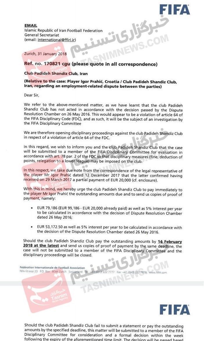 در این نامه آمده است: باشگاه پدیده باید رقم 79 هزار و 186 یورو بهعلاوه 5 درصد سود این رقم بههمراه 53 هزار و 172.5 یورو بهعلاوه 5 درصد سود این رقم را به ایگور پراهیچ پرداخت کند. باشگاه پدیده تا تاریخ 14 فوریه (25 بهمن) فرصت دارد تا مقدار قابلتوجهی از رقم تعیینشده را به این مدافع کروات بپردازد، در غیر اینصورت کمیته انضباطی فیفا تا یک هفته بعد از ضربالاجل تعیینشده تصمیمات جدیدی در این خصوص اتخاذ خواهد کرد.
