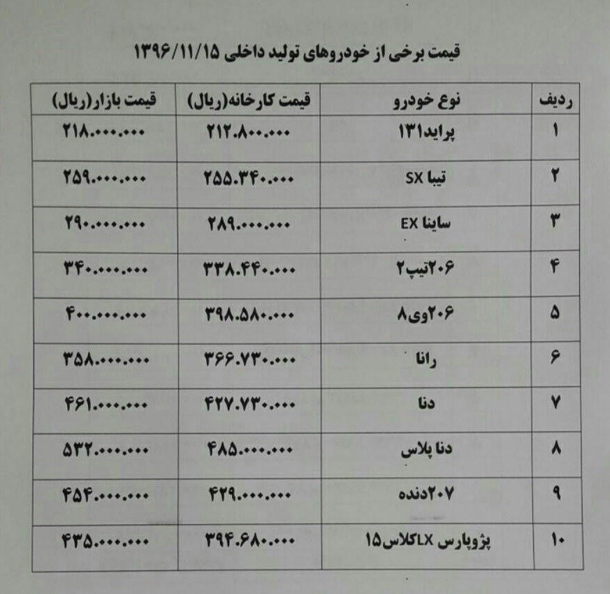 قیمت تعدادی از خودروهای داخلی بهشرح زیر است: