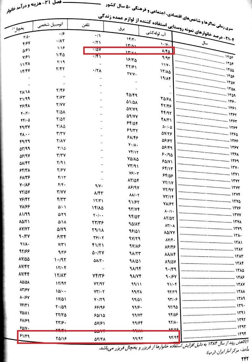 بر این اساس قسمت مهم افزایش رفاه درخانوارهای روستایی ایجاد شده و درصد خانوارهای نمونه استفاده کننده از لوازم عمده زندگی دچار تحول اساسی شده است. به این ترتیب در سال 54 میزان استفاده خانوار روستایی از آب لوله کشی حدود 8.5درصد بوده که در سال 94 این شاخص به حدود 94.5درصد رسیده است. میزان استفاده از برق خانگی از 13.5 به 99درصد افزایش یافته است. همچنین شاخص استفاده از تلفن از 0.21 درصد به 52 درصد بالغ شده است. میزان استفاده از اتومبیل شخصی نیز از 0.6 درصد به 25.16 درصد در سال 94 افزایش یافته است. میزان استفاده از یخچال در خانوارهای روستایی از 4.6 درصد در سال 54 به 61 درصد در سال 94 رشد پیدا کرده است.