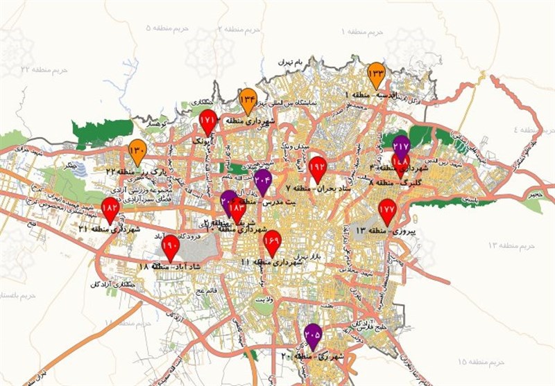 در حال حاضر نارمک (منطقه چهار) با شاخص 217 آلوده‌ترین و اقدسیه (منطقه یک) با شاخص 133 سالم‌ترین منطقه تهران محسوب می‌شوند؛ عدد شاخصهای ذرات معلق کمتر از 2.5 میکرون در شهر تهران به‌ترتیب ناسالم بودن به‌‌شرح ذیل است: