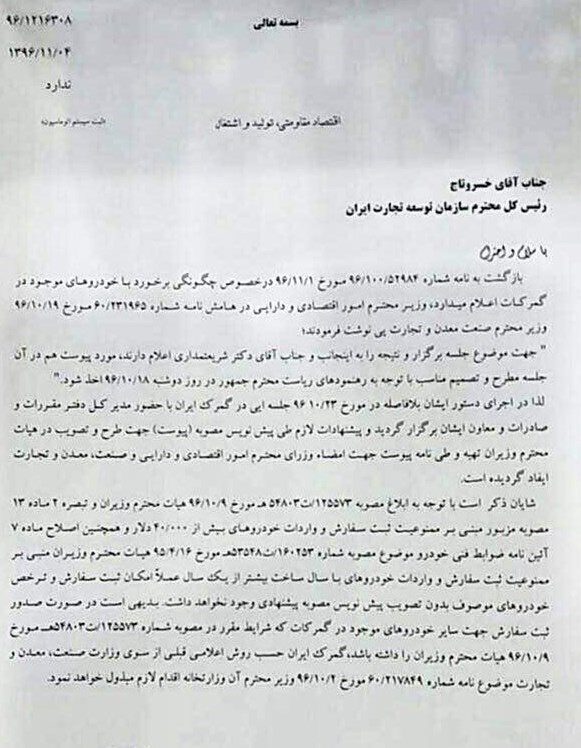 فرود عسگری در این نامه تاکید کرده، با توجه به مصوبه هیئت وزیران در خصوص ممنوعیت ثبت سفارش و واردات خودروهای با سال ساخت بیشتر از یک سال عملا امکان ترخیص خودروهای موصوف بدون تصویب پیش نویس مصوبه پیشنهادی وجود نخواهد داشت.
