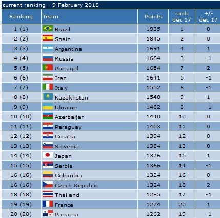 ردهبندی 20 تیم نخست فوتسال جهان به شرح زیر است: