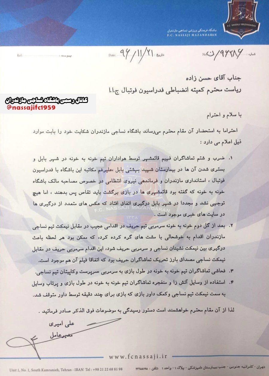 امیری همچنین طی نامه‌ای دیگر به اسماعیل حسن‌زاده، رئیس کمیته انضباطی مراتب شکایت باشگاه نساجی از اتفاقات دیدار این تیم مقابل خونه‌به‌خونه را اعلام و خواستار رسیدگی به این اتفاقات شد.