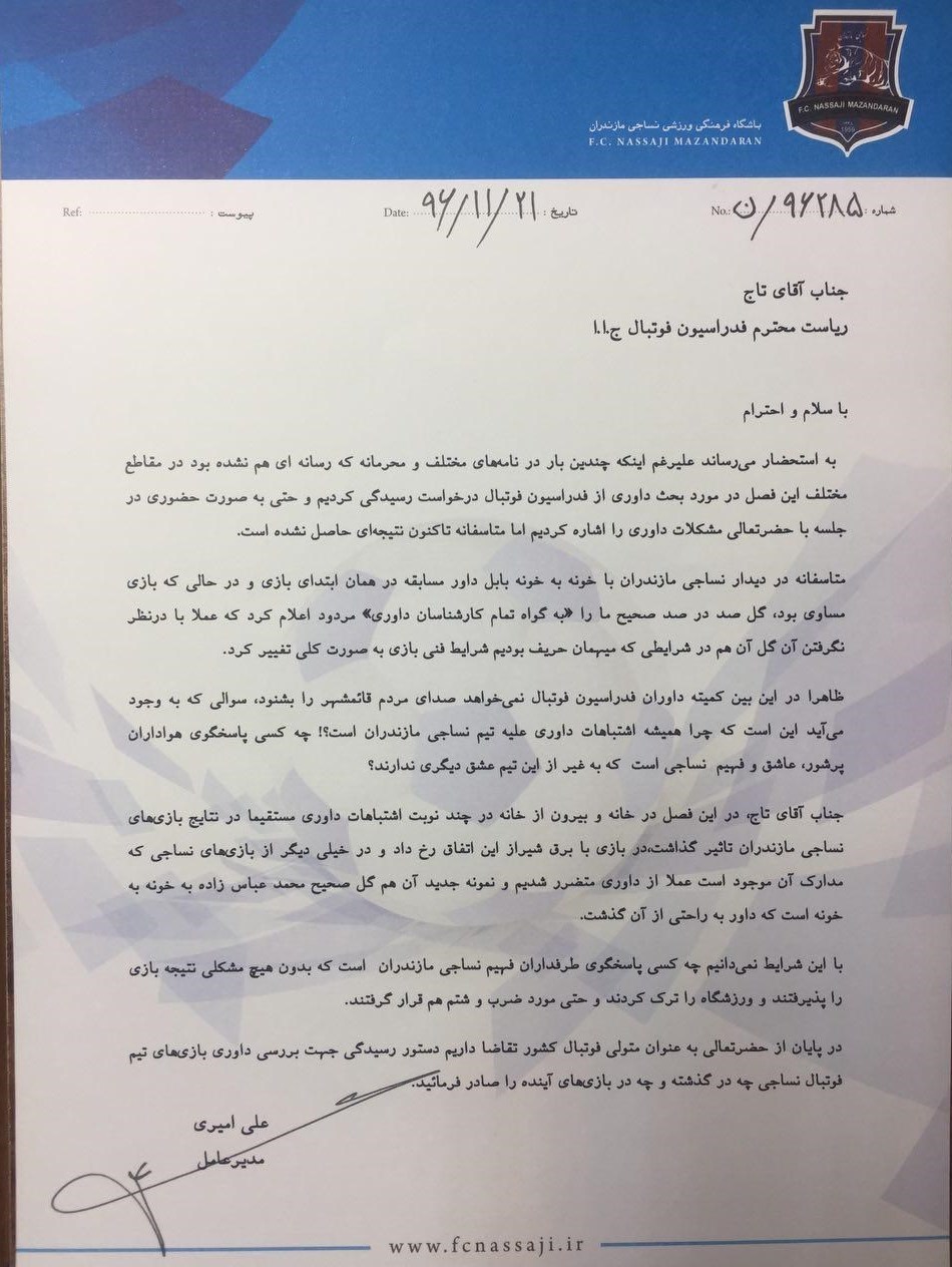 به گزارش گروه ورزشی باشگاه خبرنگاران تسنیم «پویا»، علی امیری، مدیرعامل باشگاه نساجی قائمشهر طی نامه‌‌ای به مهدی تاج، رئیس فدراسیون فوتبال خواستار رسیدگی او به موضوع داوری در دیدارهای این تیم در فصل جاری لیگ دسته اول شد.