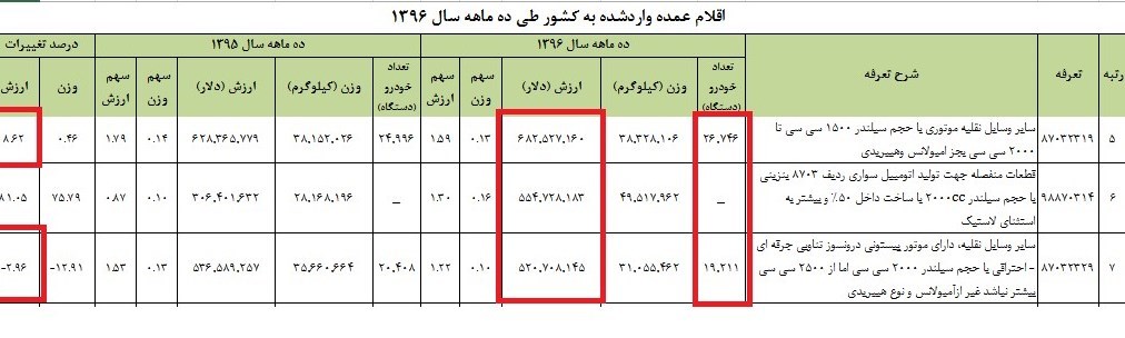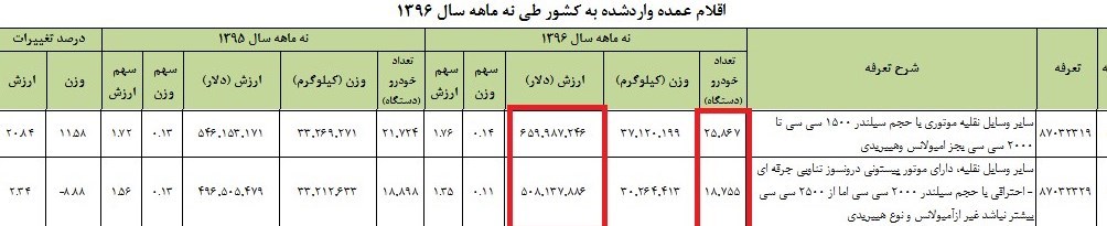 همچنین 19200 خودرو با حجم 2000 تا 2500 سیسی از گمرکات مختلف وارد کشور شده که ارزش آنها بیش از 520 میلیون دلار بوده است، به این ترتیب تنها در این دو مورد (بهغیر از خودروهای هیبریدی) نزدیک به 46 هزار خودرو وارد کشور شده است. در مدت مشابه سال قبل تنها 44 هزار خودرو از مدلهای مذکور به کشور وارد شده بود.