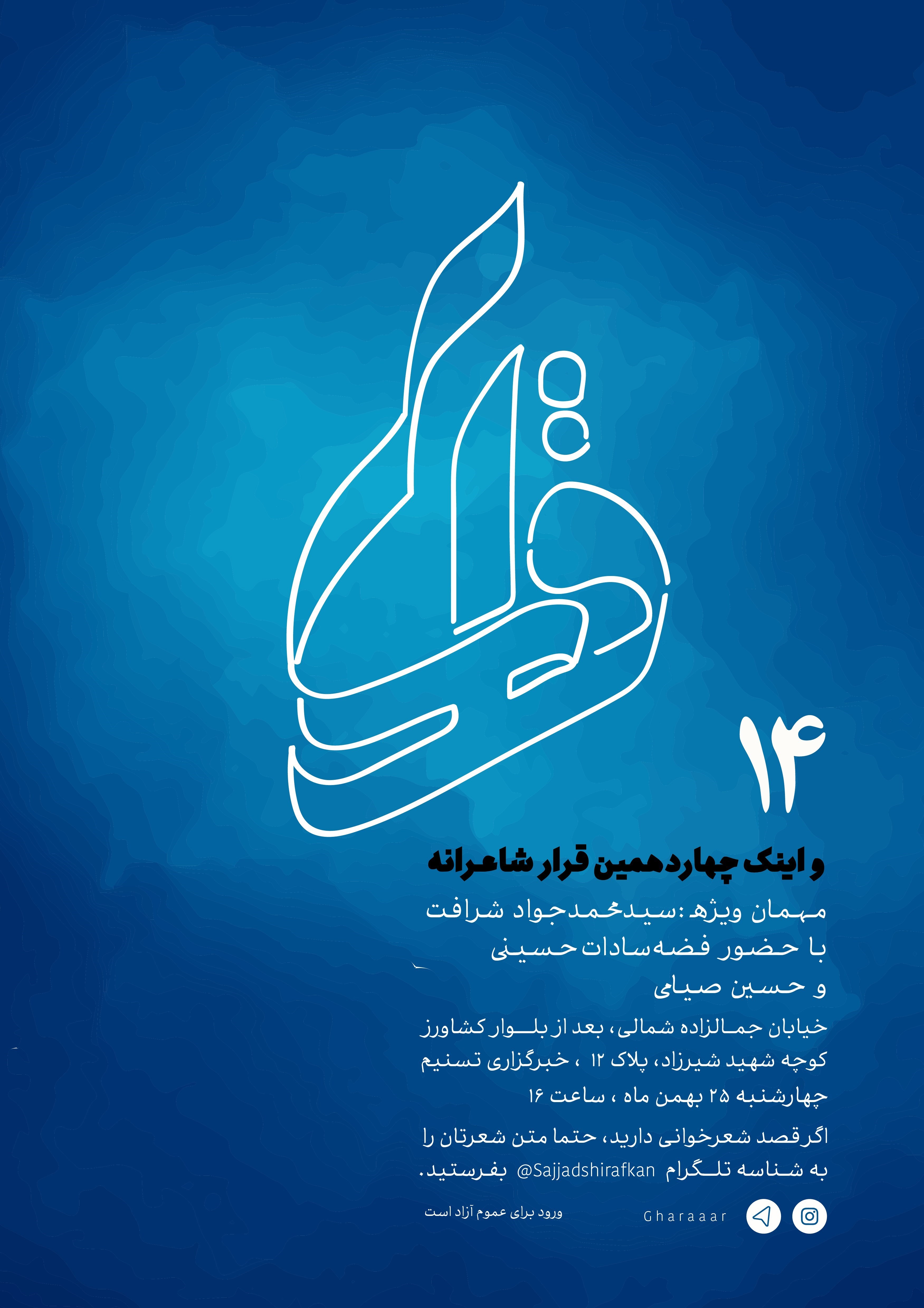 به گزارش خبرنگار فرهنگی باشگاه خبرنگاران پویا، چهاردهمین جلسه از محفل شاعرانه «قرار» امروز چهارشنبه 25 بهمن ماه از ساعت 16 الی 18 در ساختمان باشگاه خبرنگاران تسنیم واقع در خیابان جمالزاده شمالی، بعد از بلوار کشاورز، کوچه شهید شیرزاد، پلاک 12 برگزار میشود.