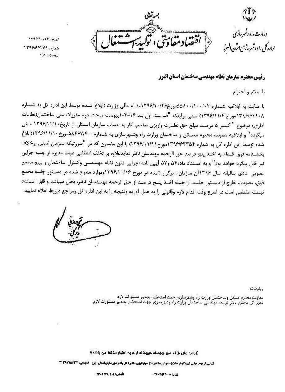 « با عنایت به ابلاغیه 55800/100/02 مورخ 1396/10/26 مقام عالی وزارت مبنی بر اینکه قسمت اول بند 16-3-1 پیوست مبحث دوم مقررات ملی ساختمان موضوع کشر 5 درصد مبلغ حق نظارت واریزی صاحب کار به حساب سازمان استان از تاریخ 1396/11/10 ملغی میگردد و ابلاغیه معاونت محترم مسکن و ساختمان وزارت راه و شهرسازی... موارد مطرح شده در دستور جلسه مجمع فوق، مصوبات خارج از دستور جلسه از جمله اخذ 5 درصد از حقالزحمه مهندسان ناظر باطل میباشد و قابل استناد نیست. در اسرع وقت اقدام لازم و قانونی را به عمل آورده و نتیجه را به این اداره کل و مراجع ذیربط اعلام نمایید.»