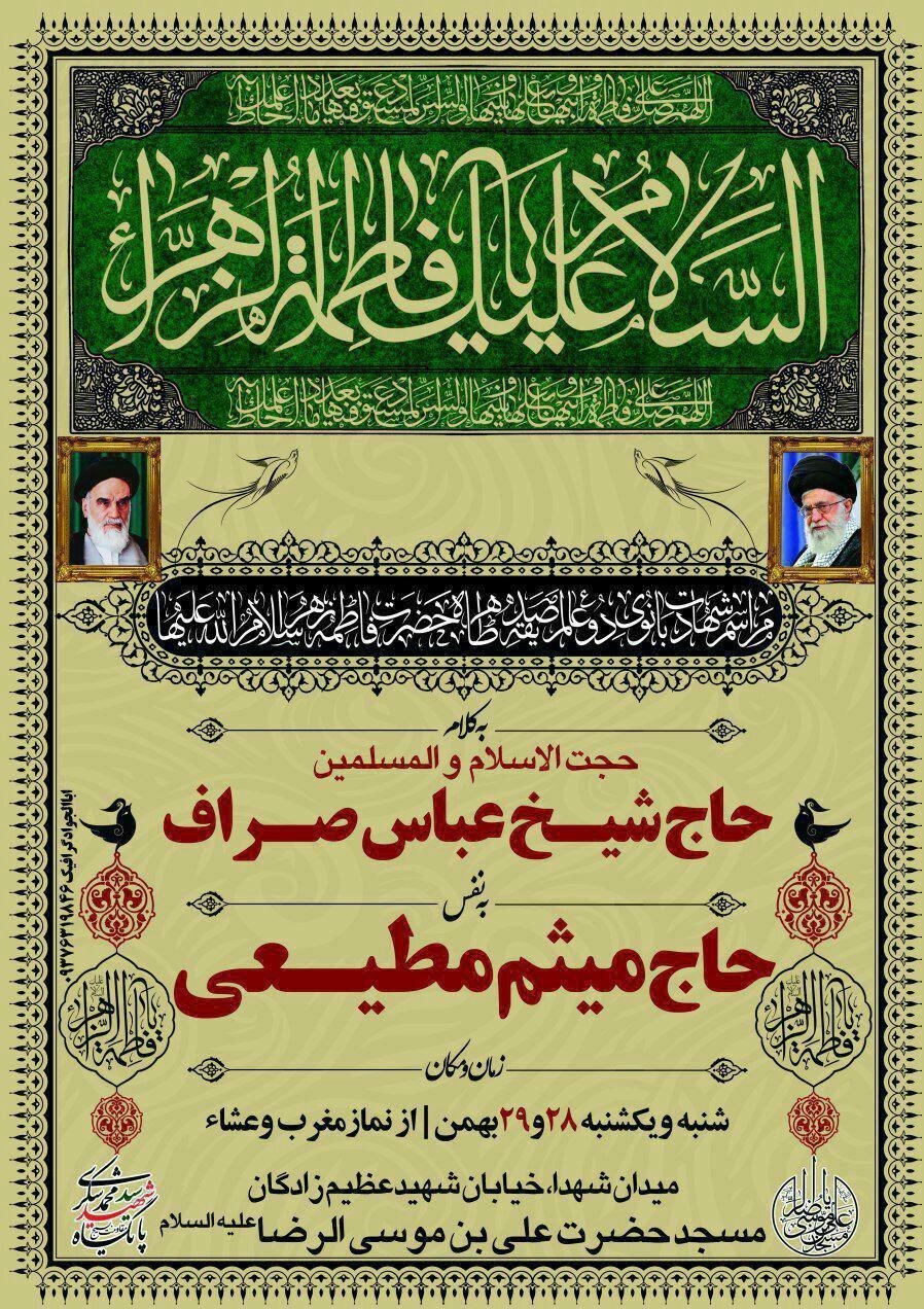 به گزارش گروه رسانه های خبرگزاری تسنیم، مراسم عزاداری شهادت حضرت زهرا "سلام الله علیها"بامداحی: حاج میثم مطیعی و سخنرانی شیخ عباس صراف برگزار می شود .