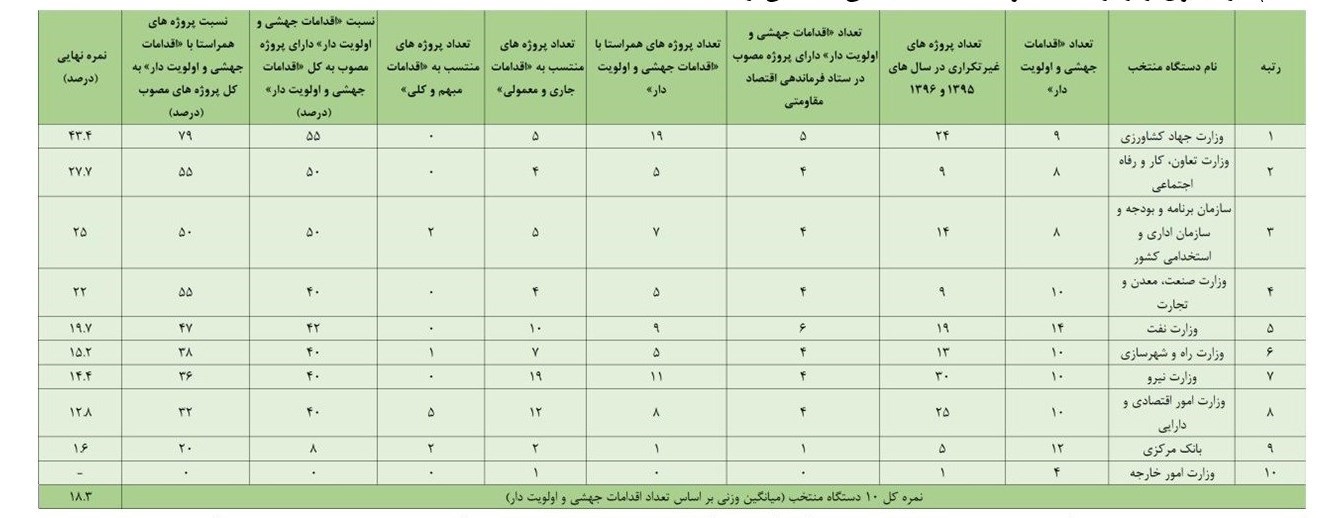 میانگین نمره 10 دستگاه منتخب بر اساس ارزیابی صورت گرفته در این فصل، برابر با 18.3 بوده است و لذا، 5 دستگاه بالاتر از حد میانگین و 5 دستگاه پایین تر از حد میانگین بوده اند. همچنین وزارت جهاد کشاورزی به عنوان شاگرد اول اقتصاد مقاومتی با نمره 43.4 از 100 در صدر جدول قرار دارد.