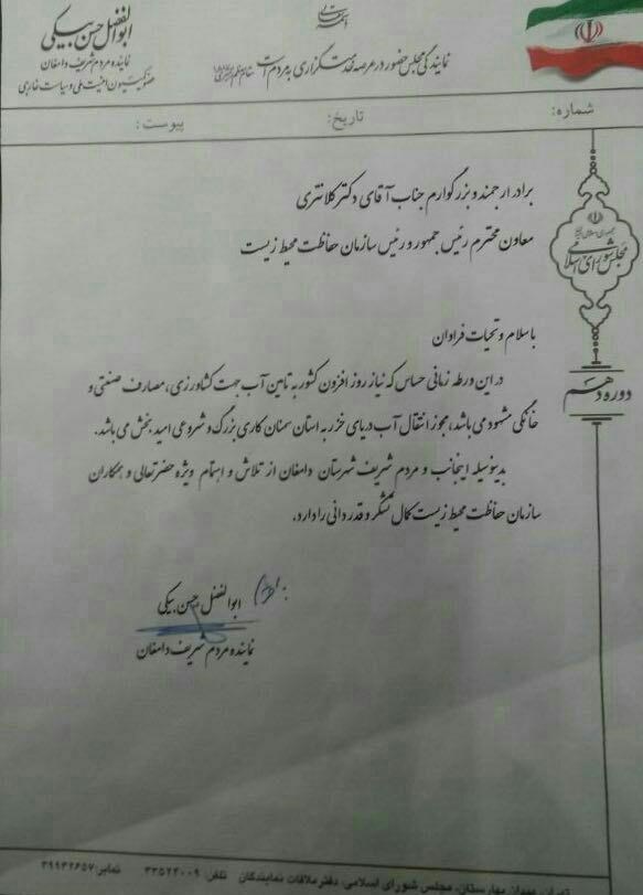 در ادامه نامه نماینده مردم دامغان استان سمنان در مجلس خطاب به عیسی کلانتری آمده که "ابوالفضل حسن بیکی" بهعنوان نماینده این استان و البته عضو کمیسیون امنیت ملی مجلس از رئیس سازمان محیط زیست به خاطر "دادن مجوز انتقال آب دریای خزر به استان سمنان" تقدیر و تشکر کرده است!!