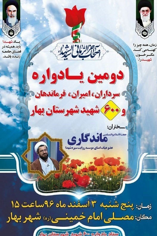 دومین یادواره امیران، سرداران، فرماندهان و 600 شهید شهرستان بهار با حضور حجت‌الاسلام محمدمهدی ماندگاری برگزار می‌شود.