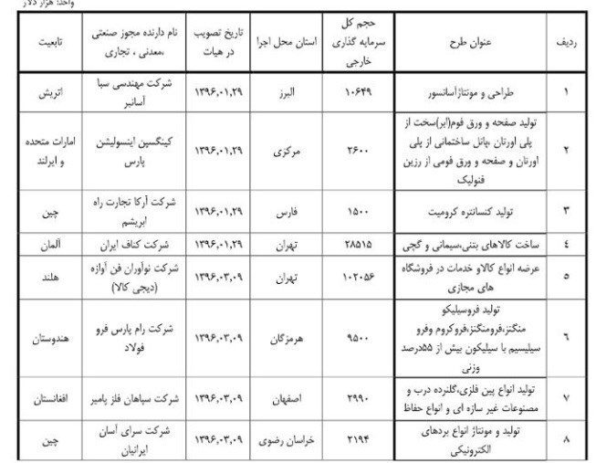 جزئیات سرمایه گذاری خارجی در بخش های مختلف صنعت و معدن طی9 ماهه امسال به شرح زیر است: