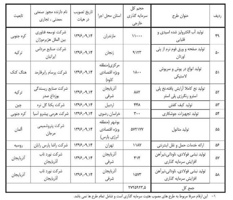 مطابق آمار در 9 ماهه امسال 58 طرح به تصویب هیأت سرمایه گذاری رسیده که حجم کل سرمایه گذاری در این طرح‌ها با روندی منفی 2.7 میلیارد دلار است.