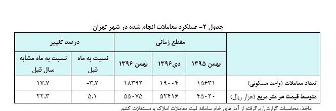 در عین حال تعداد معاملات آپارتمان های مسکونی شهر تهران در بهمن ماه سال جاری نسبت به ماه مشابه سال قبل 17.7 درصد افزایش داشته است.