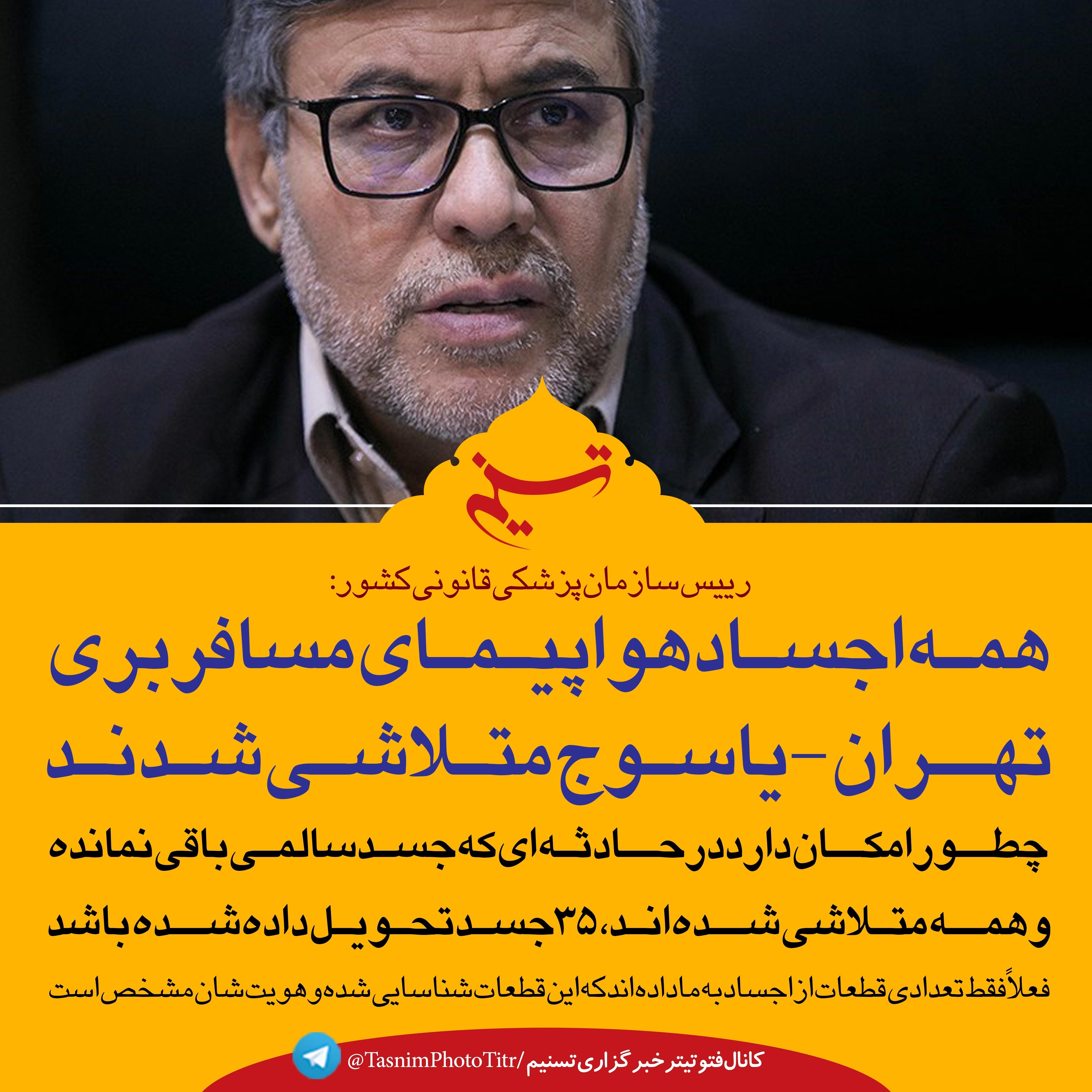 رییس سازمان پزشکی قانونی کشور درباره تحویل 35 جسد از اجساد حادثه سقوط هواپیمای تهران ــ یاسوج به پزشکی قانونی گفت: چطور امکان دارد در حادثه‌ای که جسد سالمی باقی نمانده و همه متلاشی شده‌اند، 35 جسد تحویل داده شده باشد.