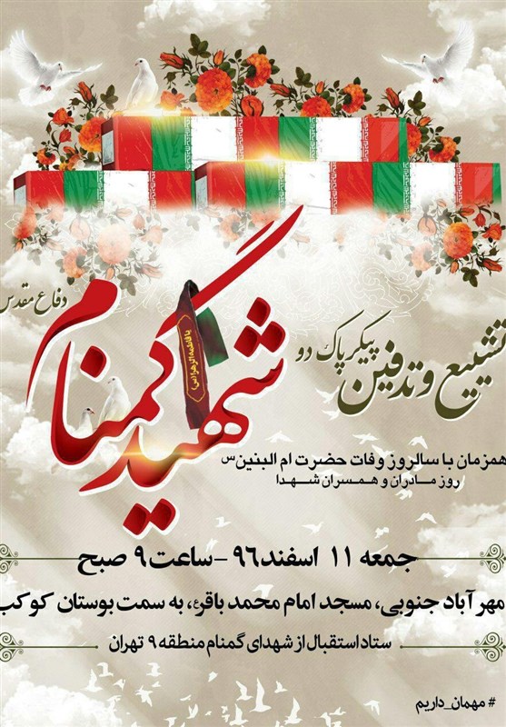 پیکر مطهر این دو شهید گمنام ساعت 9 صبح از مقابل مسجد امام محمد باقر(ع) واقع در مهرآباد جنوبی تشییع و در بوستان کوکب به خاک سپرده خواهند شد.