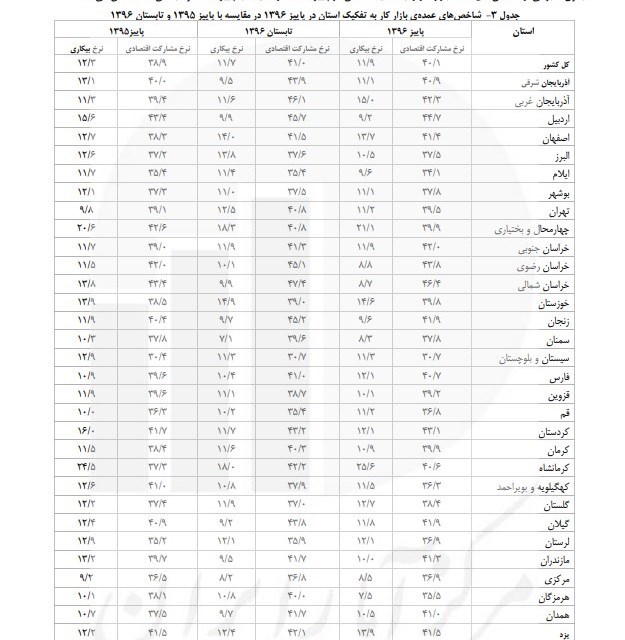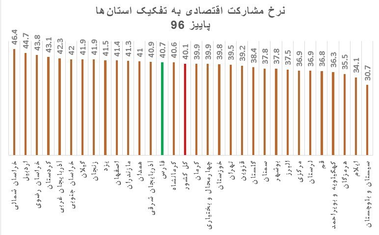 در پاییز 96 نرخ مشارکت اقتصادی جمعیت 10 ساله و بیشتر استان فارس 40.7 بوده است که نسبت به فصل مشابه سال گذشته 1.1 درصد افزایش و نسبت به فصل تابستان امسال 0.3 درصد کاهش یافته است.