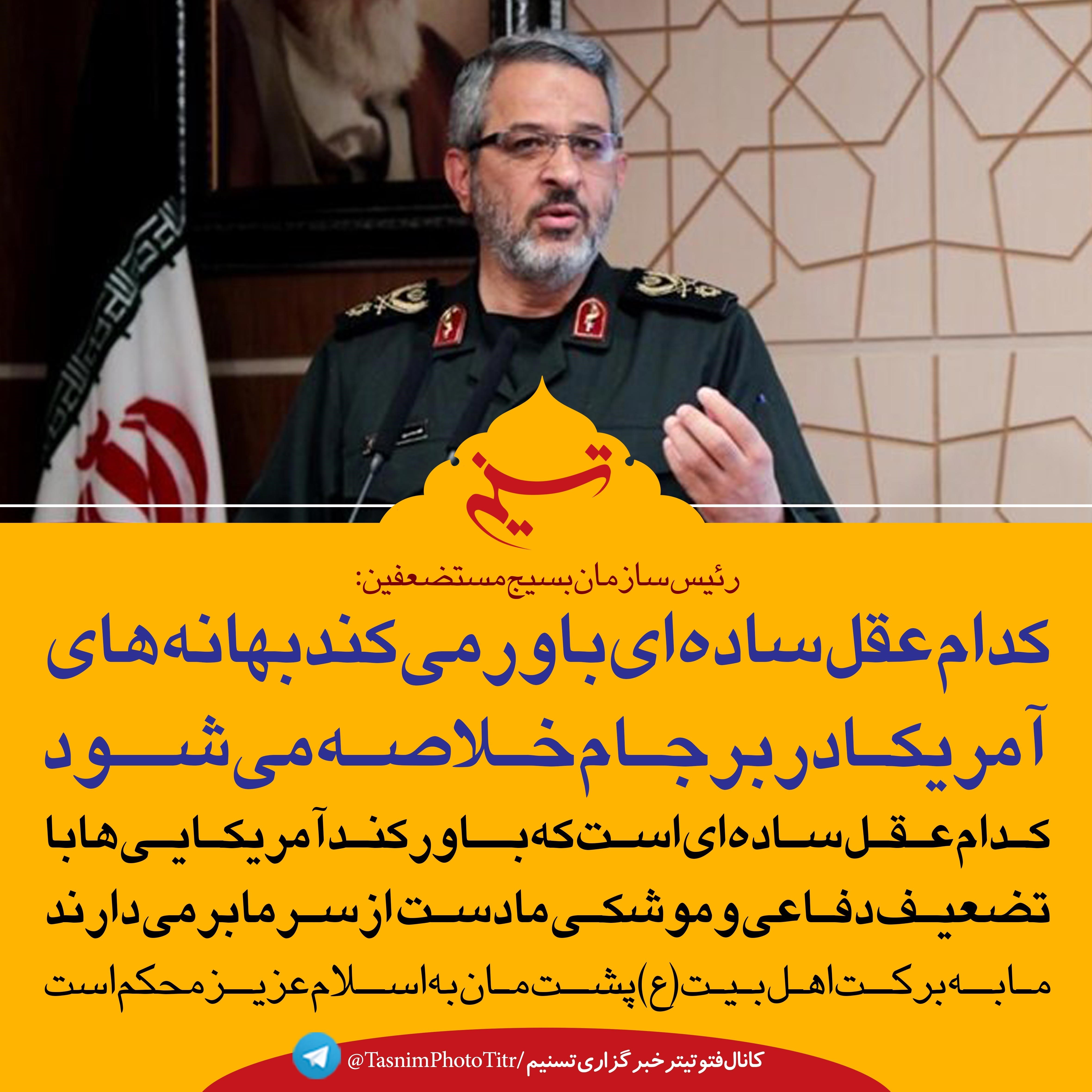 رئیس سازمان بسیج مستضعفین گفت: کدام عقل ساده‌ای است که باور کند بهانه‌های آمریکا در برجام خلاصه می‌شود و کدام عقل ساده‌ای است که باور کند آمریکایی‌ها با تضعیف دفاعی و موشکی ما دست از سر ما برمی‌دارند.