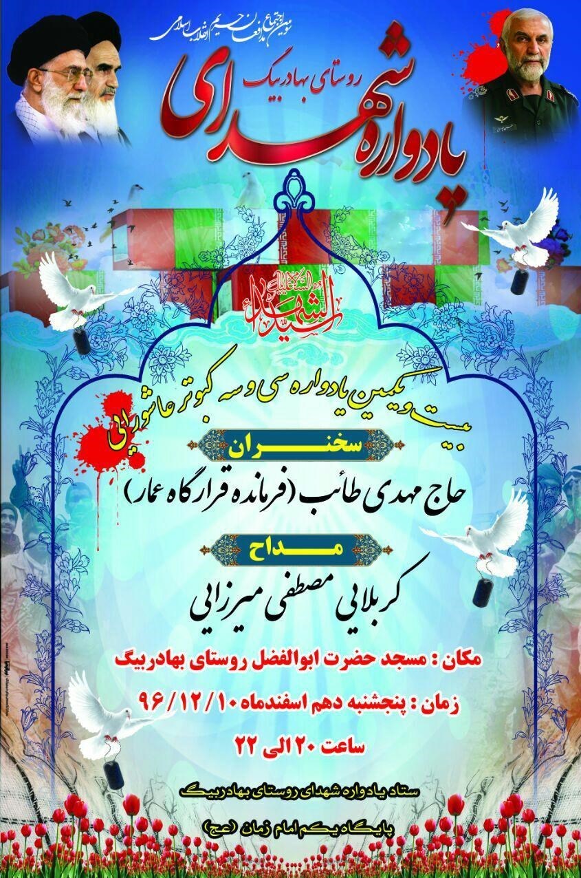 یادواره 33 شهید والامقام روستای بهادر بیک شهرستان بهار به همت ستاد یادواره شهدای این روستا و پایگاه یکم امام زمان(عج) برگزارشده و حجت‌الاسلام مهدی طائب، فرمانده قرارگاه عمار در آن سخنرانی می‌کند.