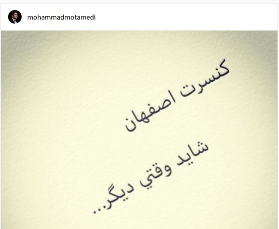 «دوستان ارجمند اصفهانی! متاسفانه علیرغم درخواستی که برای کنسرت در تاریخ ١٧ اسفند در شهر اصفهان داده بودیم مجوز صادر نشد و باز هم توفیق دیدارتان را نخواهیم داشت. از ابتدای امسال این چندمین بار است که درخواست بنده برای اجرا در اصفهان به در بسته می خورد.