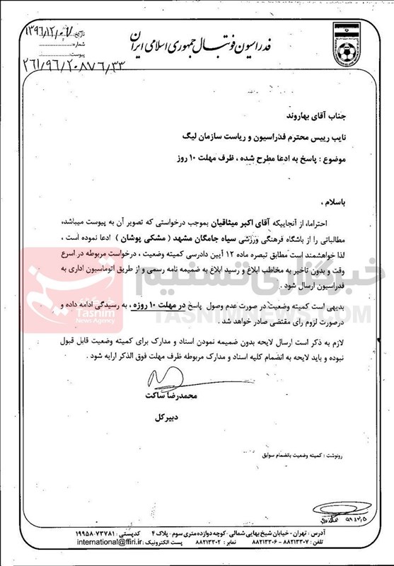 مسعود حکمآبادی مدیر رسانهای این تیم در این باره به تسنیم اعلام کرد که باشگاه مشکیپوشان به زودی پاسخ نامه فدراسیون فوتبال را خواهد داد.