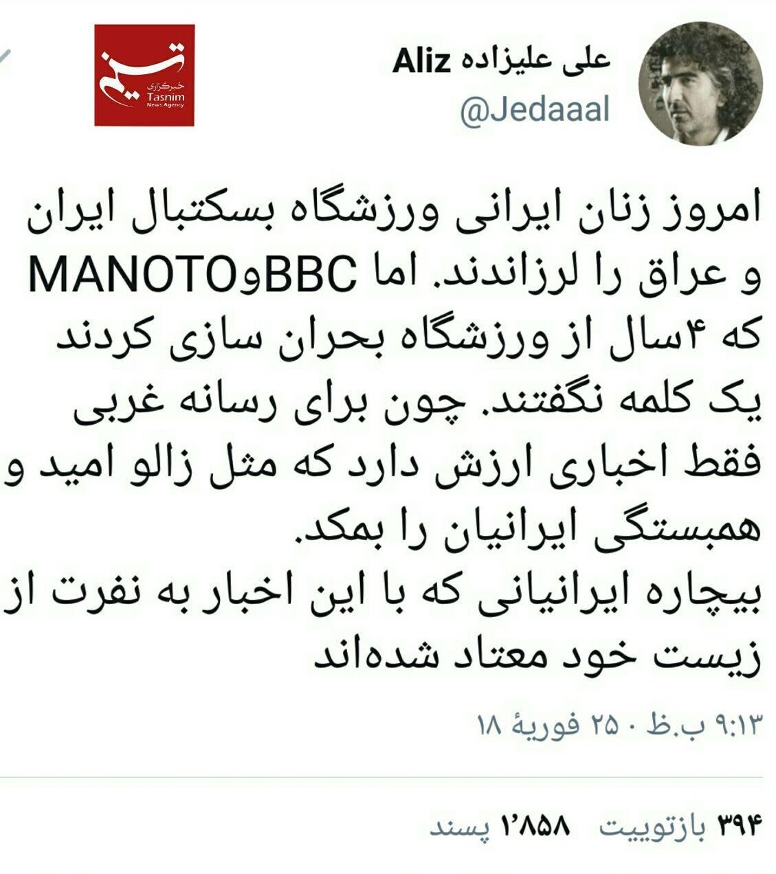 به گزارش گروه رسانههای خبرگزاری تسنیم،«علی علیزاده» تحلیلگر سیاسی ساکن لندن در واکنش به سکوت BBC و MANOTO در برابر حضور زنان ایرانی در ورزشگاه و تماشای بازی بسکتبال بین ایران و عراق در توئیتر نوشت: این رسانه ها که 4 سال از ورزشگاه بحران سازی کردند یک کلمه چیزی نگفتند چون برای رسانه غربی فقط اخباری ارزش دارد که مثل زالو امید و همبستگی ایرانیان را بمکد.