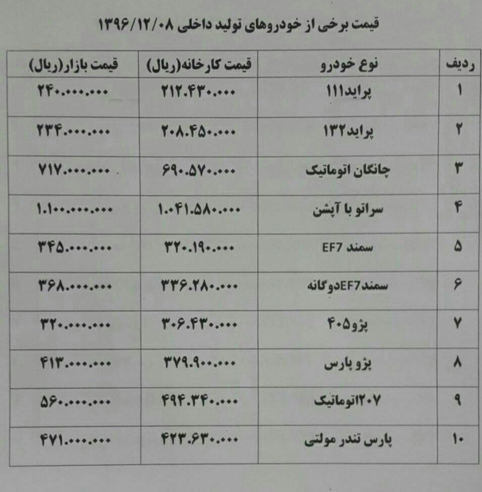 در حال حاضر دناپلاس ــ 56 میلیون تومان، پژو 207 اتوماتیک ــ 56 میلیون و 300 هزار تومان، پژو 405SLX ــ 34 میلیون و 300 هزار تومان، سمند LX ــ 34 میلیون و 500 هزار تومان، پژو207 دندهای ــ 46 میلیون و 900 هزار تومان بهفروش میرسد.