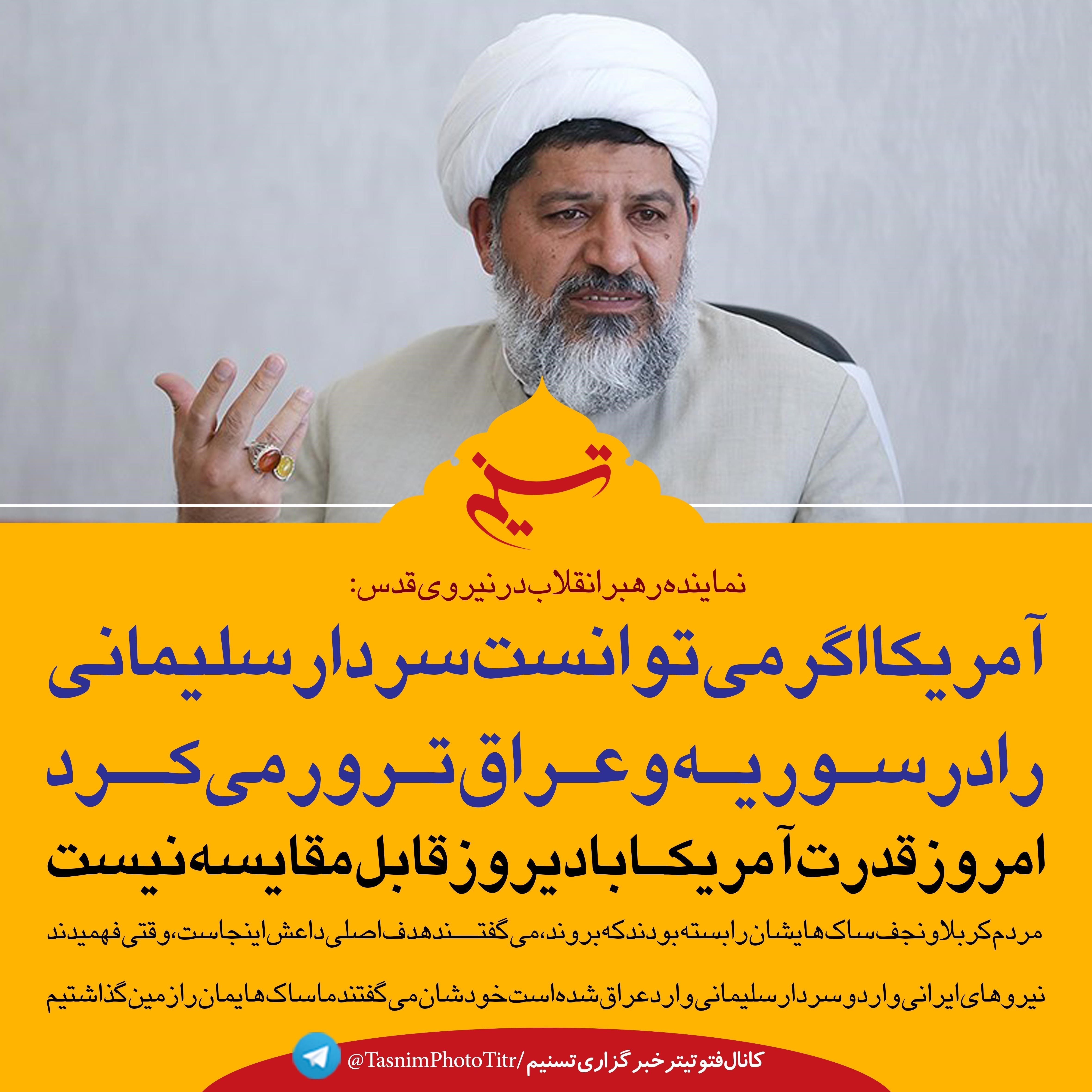 نماینده رهبر انقلاب در نیروی قدس گفت: آمریکایی‌ها اگر می‌توانستند سردار سلیمانی را ترور کنند وسط جنگ سوریه و عراق این کار را می‌کردند که جمهوری اسلامی نتواند به اهدافش برسد اما نتوانستند.