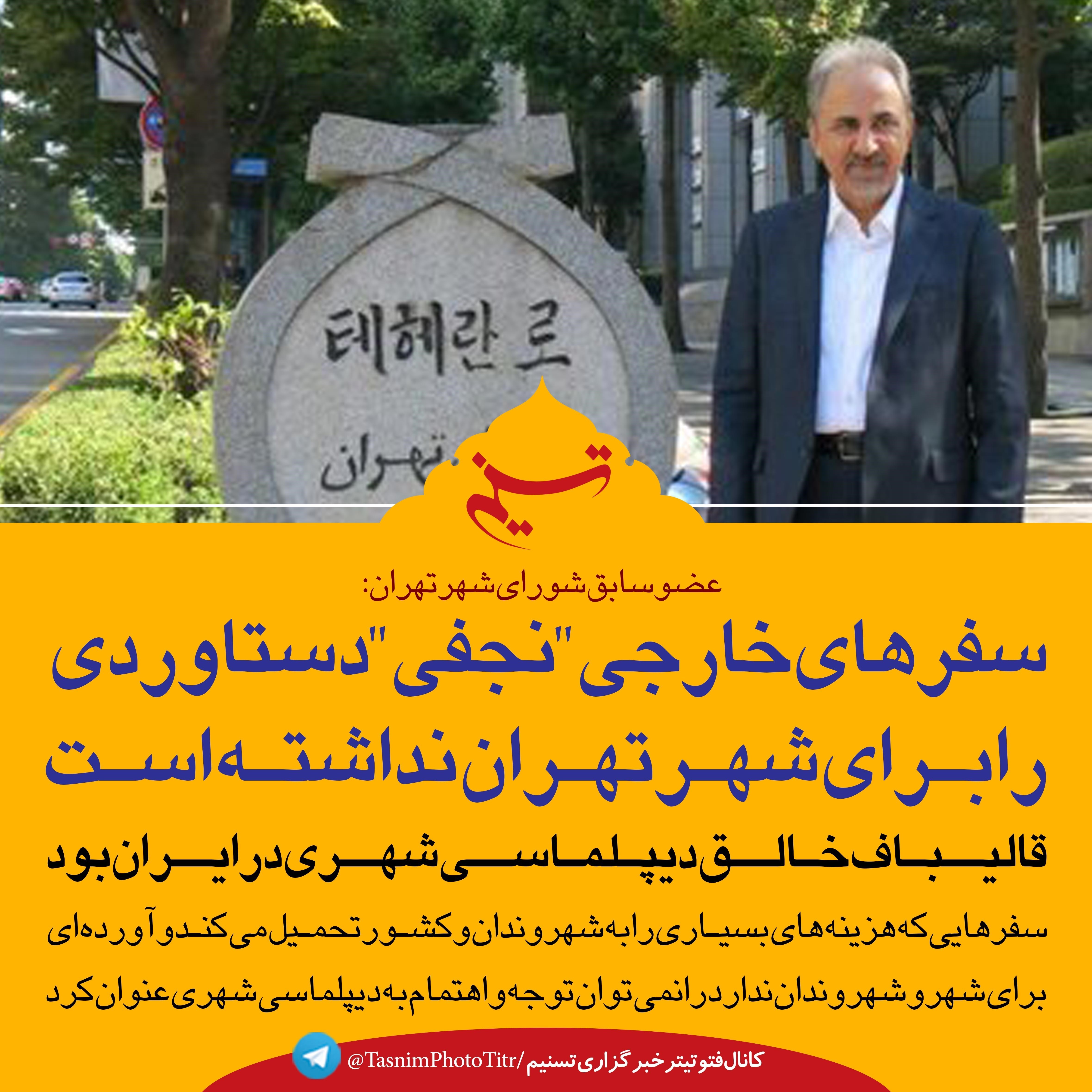 عضو سابق شورای شهر تهران گفت:سفرهای خارجی "نجفی"دستاوردی را برای شهر نداشته است و سفرهایی که هزینه‌های بسیاری را به شهروندان و کشور تحمیل می‌کند و آورده‌ای برای شهر وشهروندان ندارد را نمی‌توان توجه و اهتمام به دیپلماسی شهری عنوان کرد.