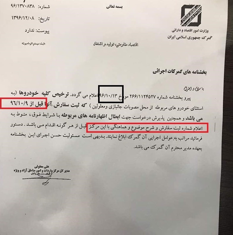 اما بعد از انتشار این سند در تسنیم، گمرک ایران مجددا نسخه به روز شده این بخشنامه را به صورت عمومی و طریق کانال تلگرامی خود منتشر کرد. در این سند نیز به مانند بخشنامه آذر ماه بر مراقبت گمرکات اجرایی در ترخیص خودرو با ثبت سفارشهای تمدیدی پرداخته شده بود.