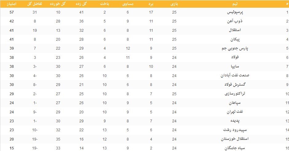 جدول ردهبندی لیگ برتر در پایان امروز (پنجشنبه) در ذیل آمده است: