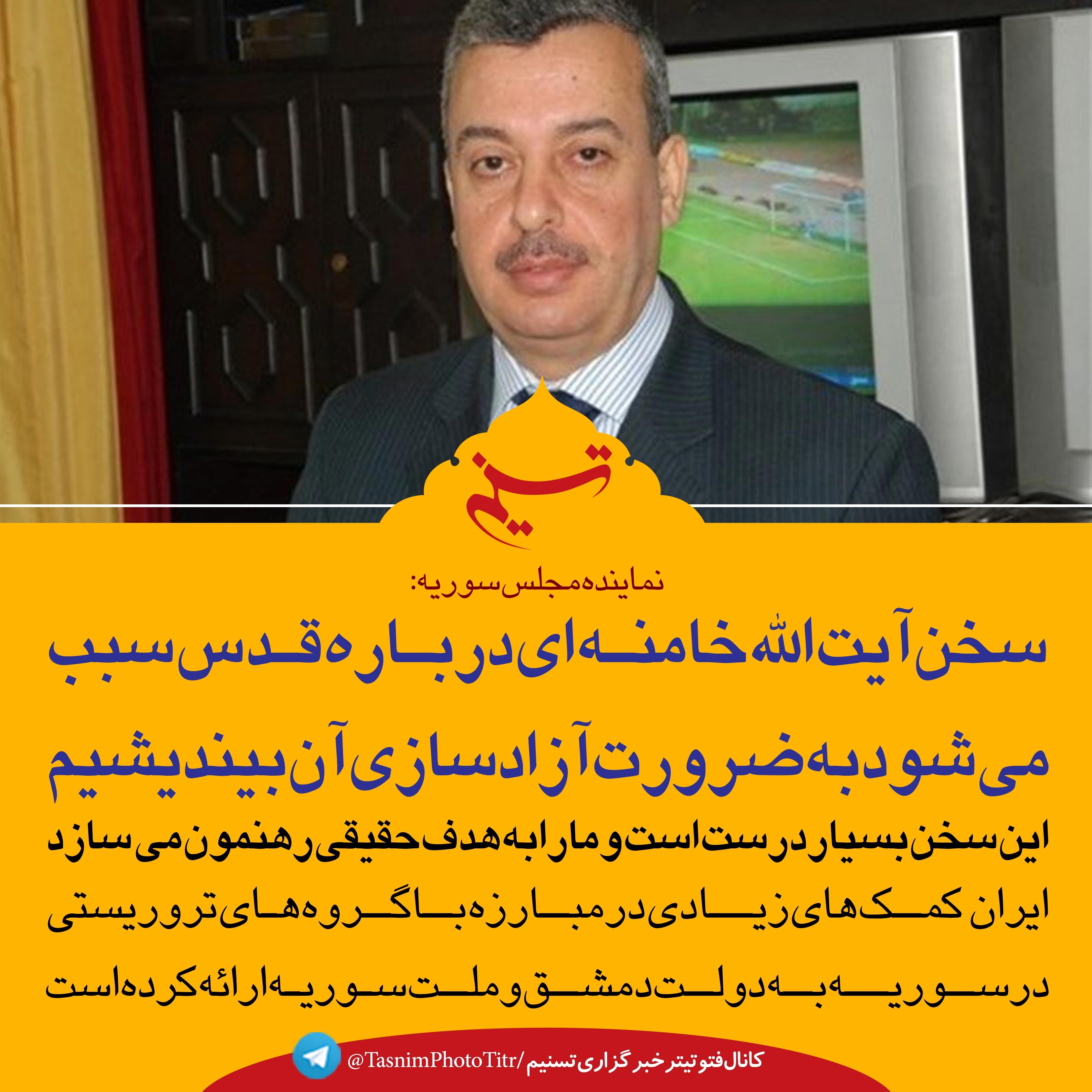 نماینده مجلس سوریه گفت: فرمایش آیت‌الله خامنه‌ای درباره قدس سبب می‌شود تا ما به ضرورت آزادسازی این شهر مقدس بیندیشیم.