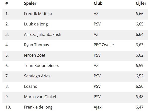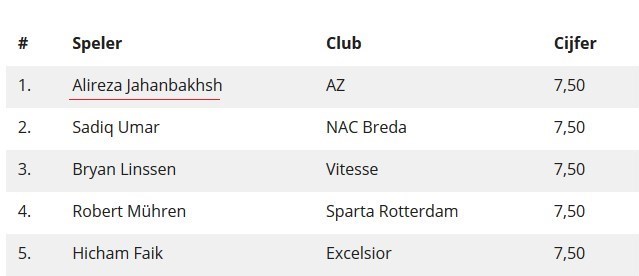 علیرضا جهانبخش در رده‌بندی 10 بازیکن برتر فصل جاری اردویژه هلند از نگاه مجله فوتبال اینترنشنال هلند نیز با امتیاز 6.64 رتبه سوم را در اختیار دارد.