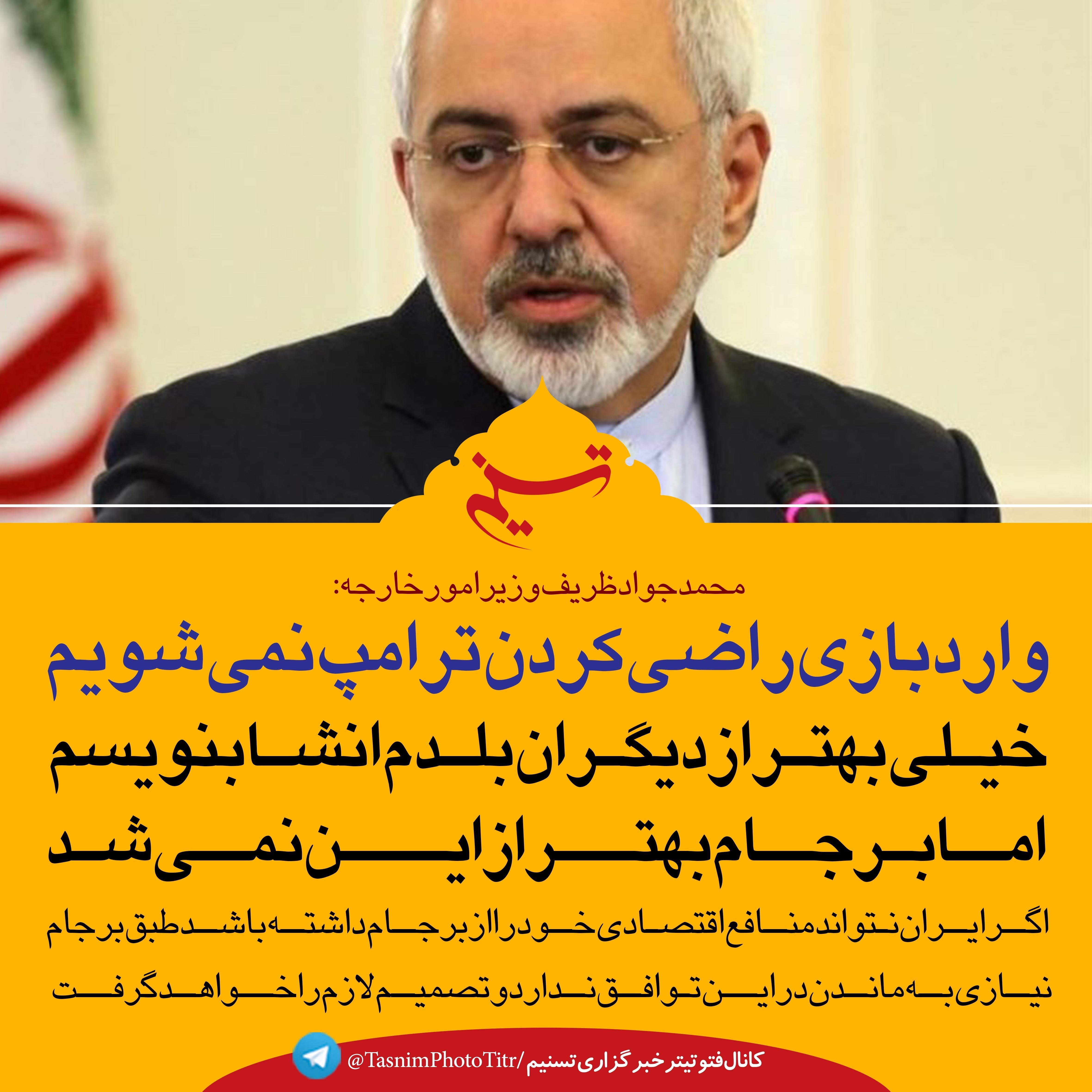 وزیر خارجه با بیان اینکه خیلی بهتر از دیگران بلدم انشا بنویسم اما برجام بهتر از این نمی‌شد، گفت: وارد بازی راضی کردن ترامپ نمی‌شویم.
