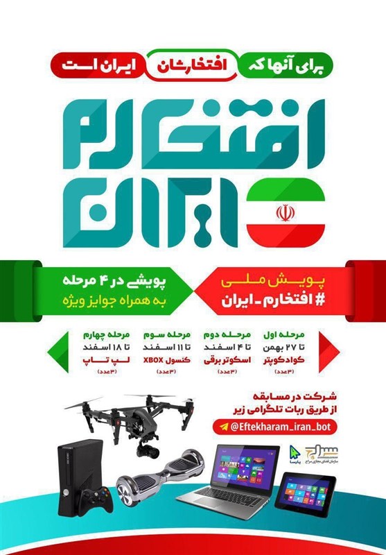 برای اینکه شما هم با یک کلیک یکی از اعضای پویش «افتخارم ایران» باشید کافی است با ثبت نام در ربات تلگرامی پویش به آدرس https://t.me/Eftekharam_iran_bot در کمتر از دو دقیقه، پوستر مورد علاقه خود را ساخته و آن را در دنیای مجازی و واقعی خود منتشر کنید.