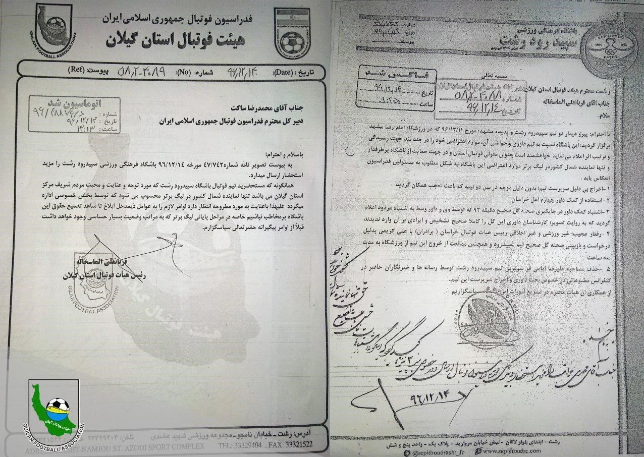 بر همین اساس هیئت فوتبال استان گیلان در نامهای به فدراسیون فوتبال نسبت به اشتباهات داوری رخ داده در دیدار تیمهای سپیدرود و پدیده اعتراض کرده و خواستار دقت بیشتر داوران در دیدارهای باقیمانده شده است.